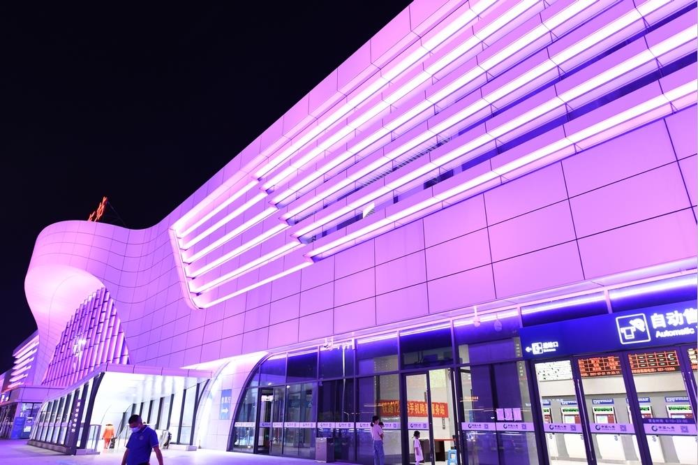 通过用DMX512控制系统,让光色在石材与玻璃营造宝玉之光,寓意玉苍之南,山海之滨的自然景观,玻璃透出的光韵好比蓝色大海, 又像是蔚蓝天空,寓意苍南海阔天空,振翅高飞的壮丽前景!