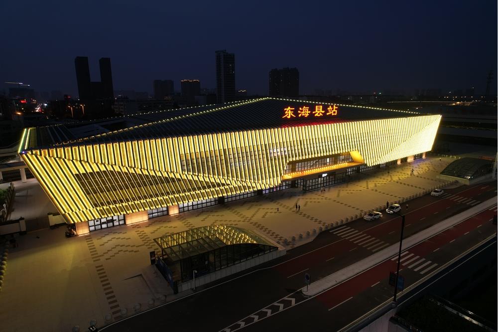 东海县站以“灿若繁星,闪耀东海”为设计理念,充分挖掘当地水晶文化,建筑形态浑然一体,大气统一, 彰显了东海水晶之都的城市形象。方案紧扣“水晶” 设计理念,汲取晶体元素特征,形体采取转折,切削的处理手法,抽象表达了水晶的特有属性。