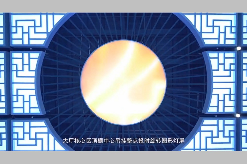 通过吊顶层次递进及变化,形成湖光潋滟、清澄空明的空间氛围。四个桥墩柱身两侧内嵌电子集成通电屏幕,LED灯光动态投影山水画卷,展现江南地域特色和文化底蕴,构筑“灯影千岛、水墨淳安”的空间意境。